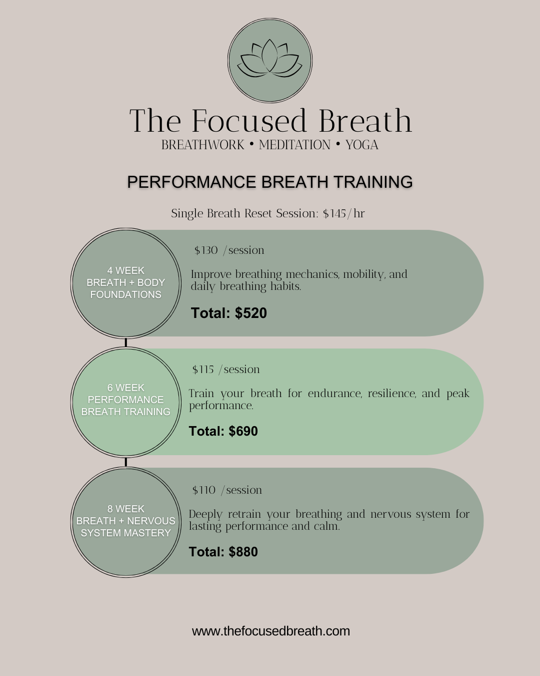 Through The Focused Breath Method, we combine breath training, meditation, and yoga to improve breathing efficiency, regulate the nervous system, and help you perform with greater endurance, resilience, and calm under pressure.